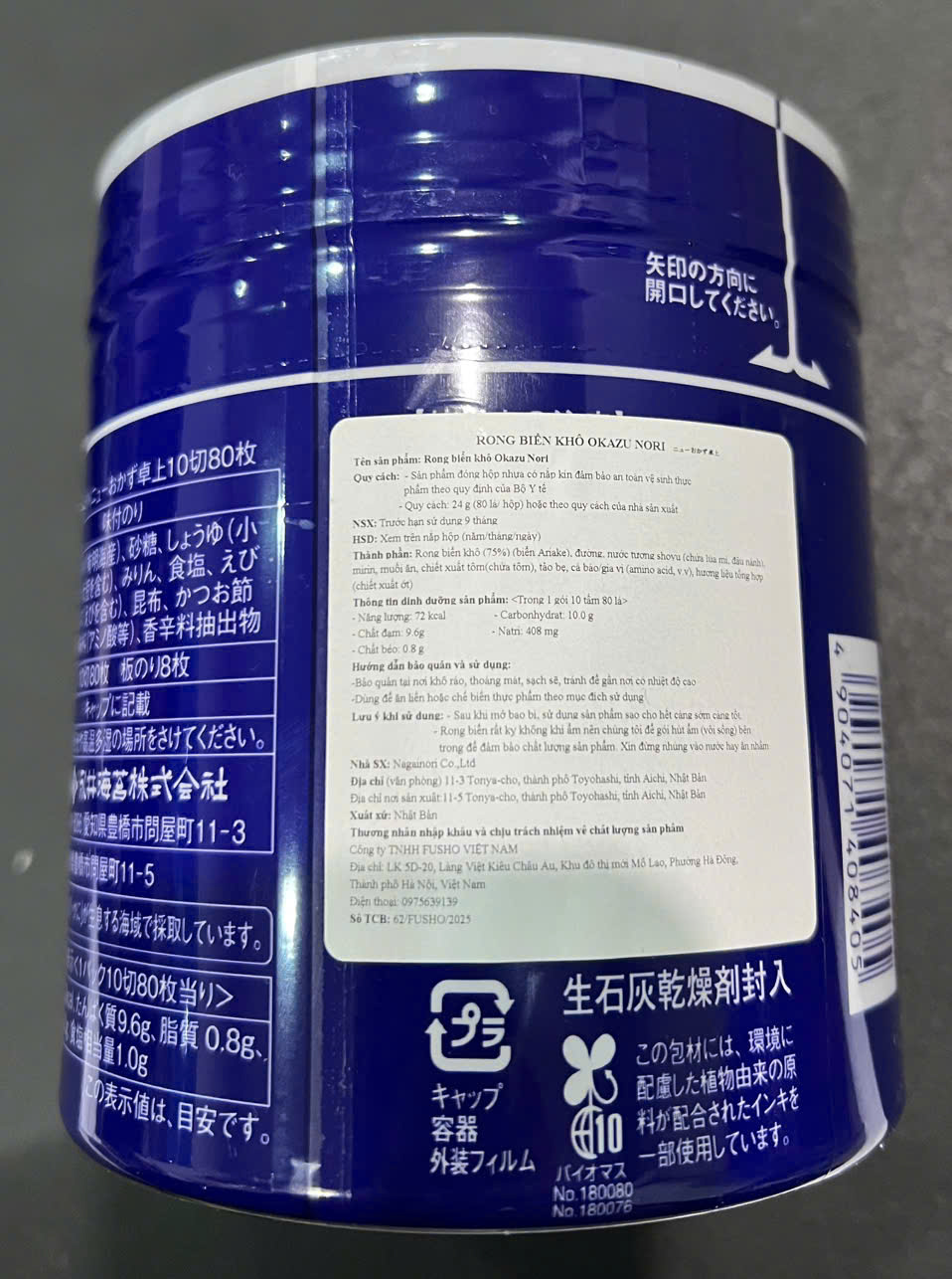 1. Thành phần: Rong biển khô(biển Ariake), đường, nước tương shoyu(chứa lúa mì, đậu nành), mirin, muối ăn, chiết xuất tôm(chứa tôm), tảo bẹ, cá bào/gia vị (amino acid, v.v), hương liệu tổng hợp( chiết xuất ớt).